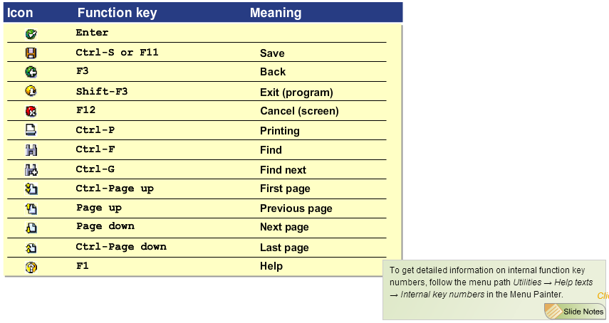 The reserved function keys appear in the standard toolbar on screens and lists. The user should reuse the existing menu bars, application toolbars, and key settings to ensure consistency. You can use the Menu Painter so that changes made in objects can reflect in statuses which use them.